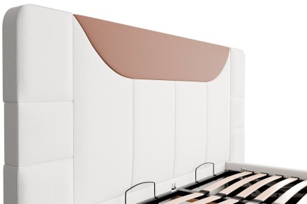 Plaza uzglavlje će vam odmah privući pažnju. Glavni deo uzglavlja se sastoji od svetle presvlake sa pravilnim, prošivenim linijama, koje dele čelo na pravougaonike različitih veličina. Koncept pravilnosti i precizne geometrije narušava znatno tamnija pruga sa krivinom u gornjem delu čela. Kontrast boja i različitih oblika daje uzglavlju element originalnosti i mašte.